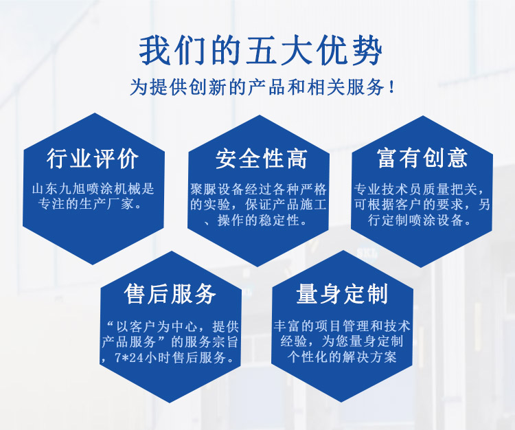 山東九旭機械科技有限公司歷經十幾年的發(fā)展,已成長為液壓聚脲設備行業(yè)頗具實力的設備制造業(yè)之一。主要產品:聚氨酯高壓噴涂機、聚氨酯高壓發(fā)泡機、液壓聚脲噴涂設備及設備配件(聚氨酯高壓噴槍、槍嘴、加熱管道、料塊、摩擦副、增壓泵、混合式、提料泵等)也是堅持最好的質量服務用戶,